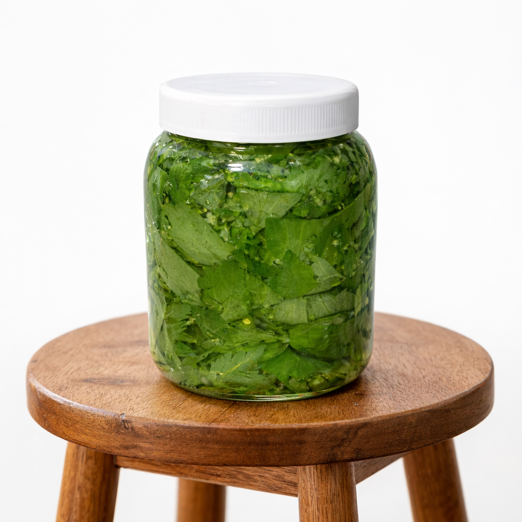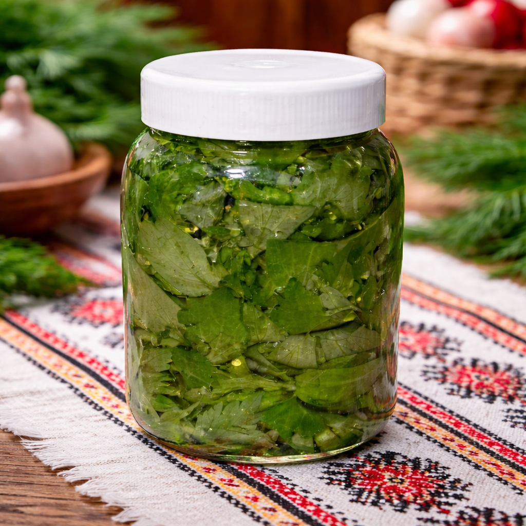 Leusteanul este taiat fin si asezat cu grija in borcan,